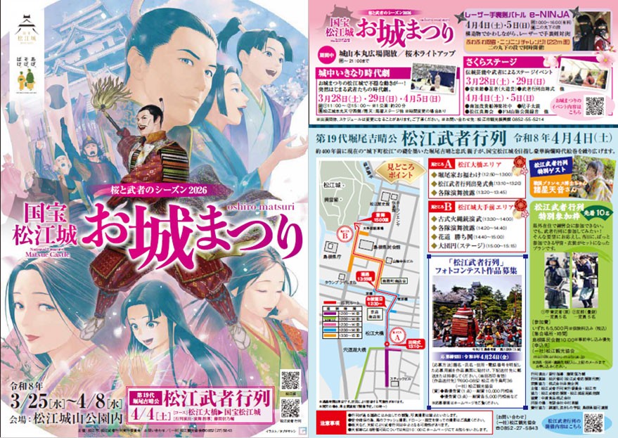 国宝松江城の桜をライトアップし、ぼんぼりが灯ります。また、「桜と武者のシーズン2026」と題し、武者行列やステージイベントも開催されます。